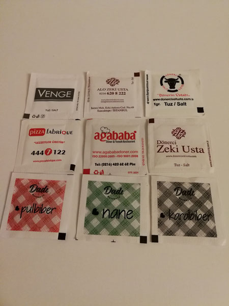 3 gr, 4 gr stick şekerler, 5 * 5 kare tuz ve baharat grubu